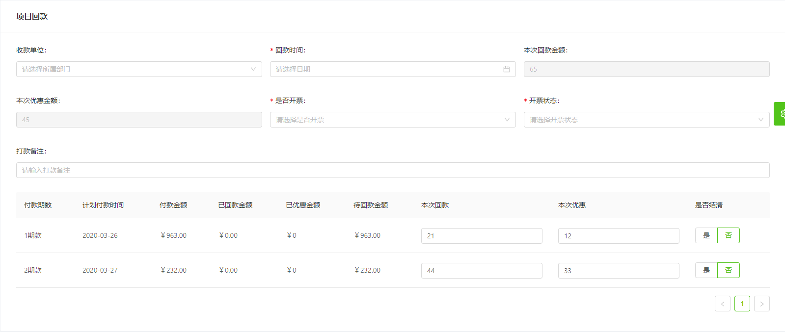 1期款和2期款都分别有各自的本次回款和本次优惠,并且上面的本次回款金额和本次优惠金额会统计两期本次回款和本次优惠的和。