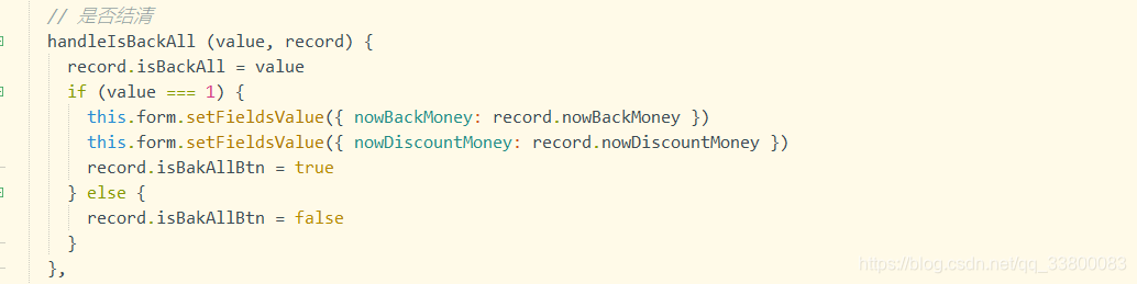// 保存输入的本次回款并计算总回款 handleInputChange (value, record) { record.nowBackMoney = value //record就是当前行的数据。这样当前行某单元格输入的数据不用太多复杂的操作就存到了各自行中的nowBackMoney属性中 var nowBackMoneySum = 0 this.data.forEach(item => { nowBackMoneySum += parseFloat(item.nowBackMoney) }) this.form.setFieldsValue({ nowBackMoneySum: nowBackMoneySum }) }