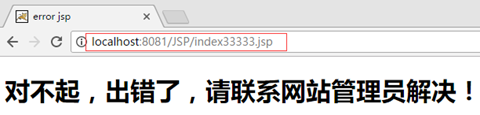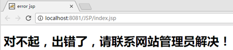 <%@ page language="java" contentType="text/html; charset=UTF-8" pageEncoding="UTF-8"%> <% String path = request.getContextPath(); String basePath = request.getScheme()+"://"+request.getServerName()+":"+request.getServerPort()+path+"/"; %> <!DOCTYPE html PUBLIC "-//W3C//DTD HTML 4.01 Transitional//EN" "http://www.w3.org/TR/html4/loose.dtd"> <html> <head> <base href="<%=basePath%>"> <meta http-equiv="Content-Type" content="text/html; charset=UTF-8"> <title>error jsp</title> </head> <body> <h1>对不起,出错了,请联系网站管理员解决!</h1> </body> </html>