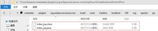 当我们通过浏览器访问index.jsp时,服务器首先将index.jsp翻译成一个index_jsp.class,在Tomcat服务器的work\Catalina\localhost\项目名\org\apache\jsp目录下可以看到index_jsp.class的源代码文件index_jsp.java