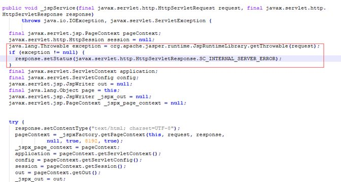 将error.jsp页面显式声明为错误处理页面后,Jsp引擎在将jsp页面翻译成Servlet的时候,在Servlet的 _jspService方法中会声明一个exception对象,然后将运行jsp出错的异常信息存储到exception对象中,由于Servlet的_jspService方法中声明了exception对象,那么就可以在error.jsp页面中使用exception对象。源码如下: