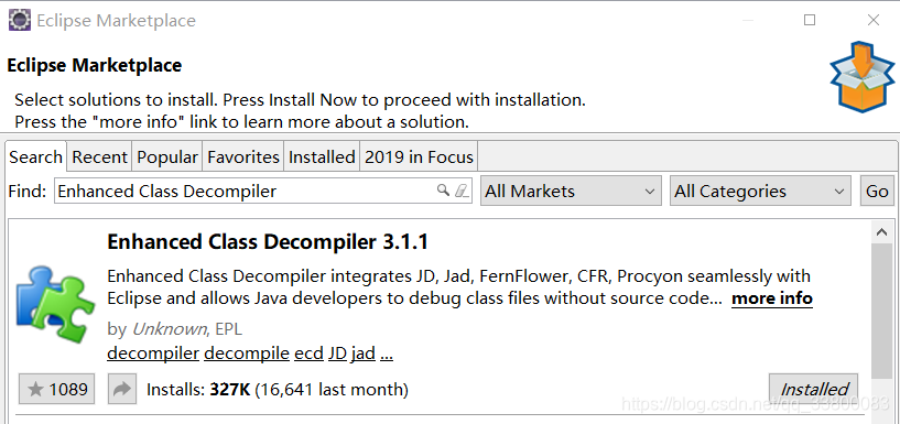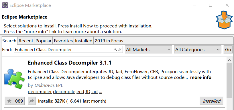 ①打开Eclipse,Help --> Eclipse Marketplace,在打开的窗口中 搜索 Enhanced Class Decompiler,直接一步步安装即可。
