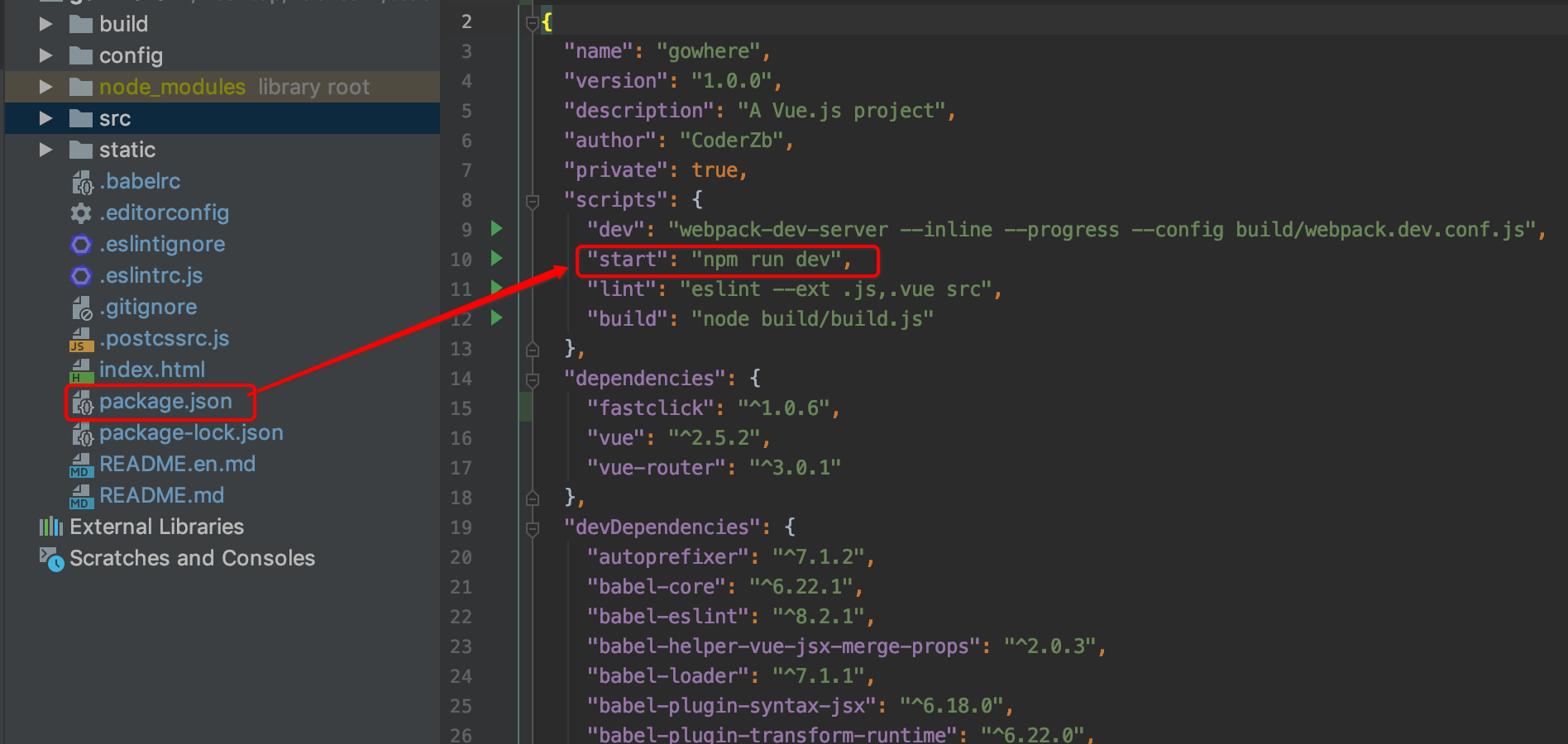 # 例如执行npm run dev 时,系统就会跑到package.json文件中执行scripts中对应的脚本