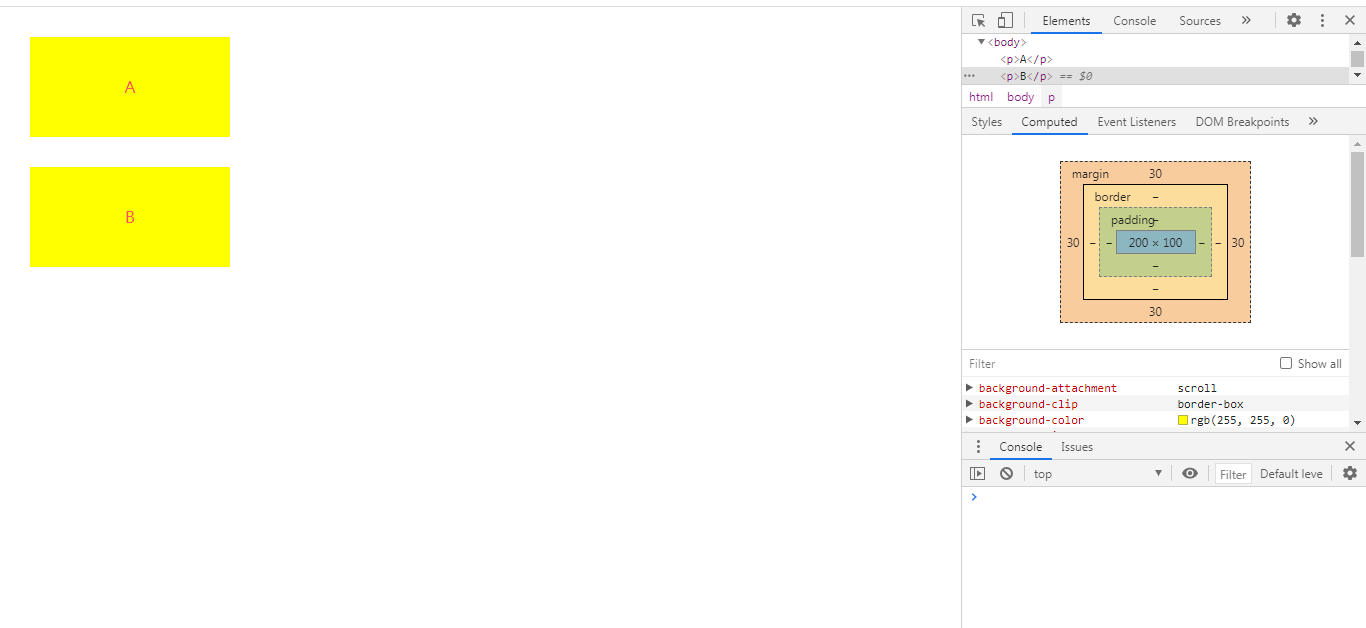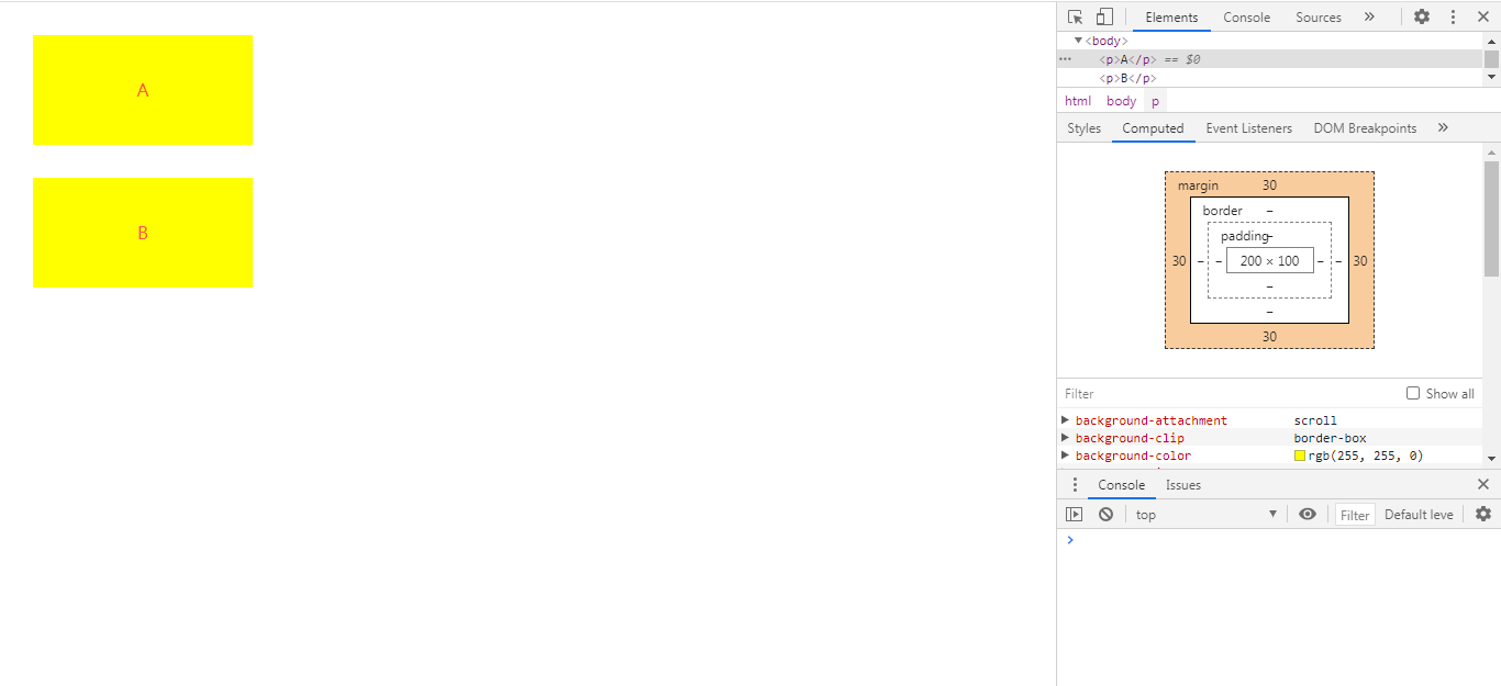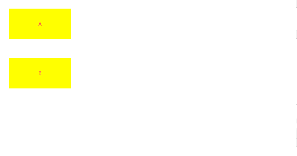 <!DOCTYPE html> <html lang="en"> <head> <meta charset="UTF-8"> <meta name="viewport" content="width=device-width, initial-scale=1.0"> <meta http-equiv="X-UA-Compatible" content="ie=edge"> <title>Document</title> </head> <style> *{ margin: 0; padding: 0; } p { color: #f55; background: yellow; width: 200px; line-height: 100px; text-align:center; margin: 30px; } </style> <body> <p>A</p> <p>B</p> </body> </html>