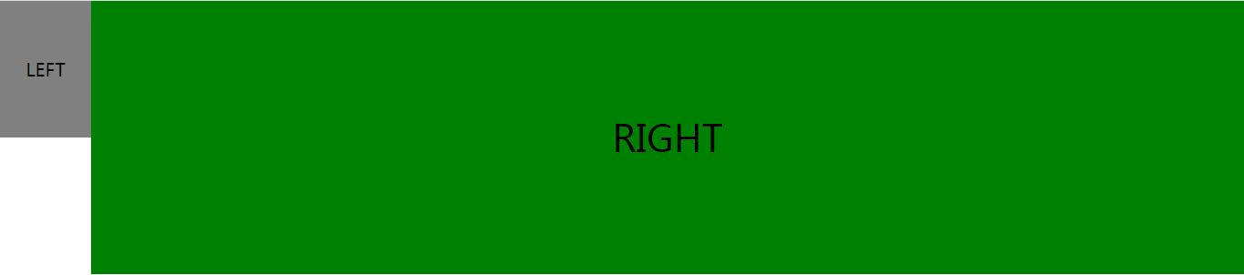 <!DOCTYPE html> <html lang="en"> <head> <meta charset="UTF-8"> <meta name="viewport" content="width=device-width, initial-scale=1.0"> <meta http-equiv="X-UA-Compatible" content="ie=edge"> <title>Document</title> </head> <style> *{ margin: 0; padding: 0; } body { width: 100%; position: relative; } .left { width: 100px; height: 150px; float: left; background: gray; text-align: center; line-height: 150px; font-size: 20px; } .right { height: 300px; background: green; text-align: center; line-height: 300px; font-size: 40px; } </style> <body> <div class="left">LEFT</div> <div class="right">RIGHT</div> </body> </html>