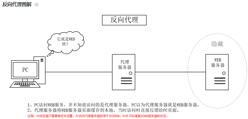 当一个代理服务器能够代理外部网络上的主机,访问内部网络时,这种代理服务的方式称为反向代理服务。此时代理服务器对外就表现为一个Web服务器,外部网络就可以简单把它当作一个标准的Web服务器而不需要特定的配置。不同之处在于,这个服务器没有保存任何网页的真实数据,所有的静态网页或者CGI程序,都保存在内部的Web服务器上。因此对反向代理服务器的攻击并不会使得网页信息遭到破坏,这样就增强了Web服务器的安全性