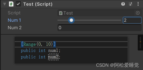 [Range(min, max)] 限制一个数值字段或属性的可接受值范围。在Inspector中,这个字段会显示为一个滑动条或输入字段,限制在指定的最小值和最大值之间。