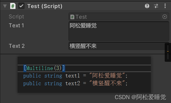 [Multiline(n)] 将字符串字段或属性在Inspector中显示为多行文本区域。可以指定行数,例如[Multiline(3)]将显示一个3行的文本区域。