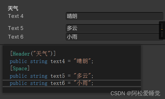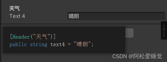 [Header("标题文本")] 在Inspector中添加一个标题,用于分隔和组织字段。