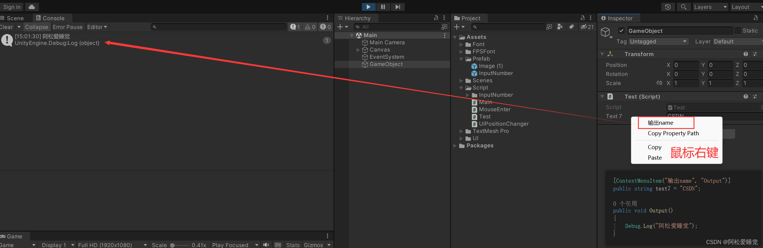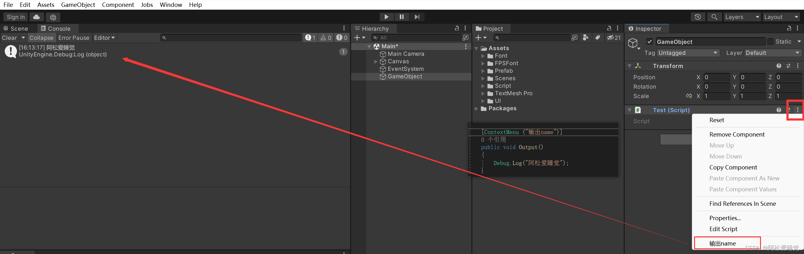 [ContextMenu ("名称")] 在Inspector面板中脚本Script的上下文菜单中添加一条指令,当点击该指令时,执行对应函数。需要注意的是修饰符只能用于非静态函数。