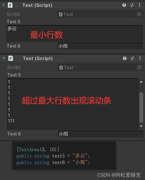 [TextArea(3, 10)] 与[Multiline]类似,但它还允许指定文本区域的最小和最大行数。超过最大行数,会出现滚动条,但[Multiline]不会出现。