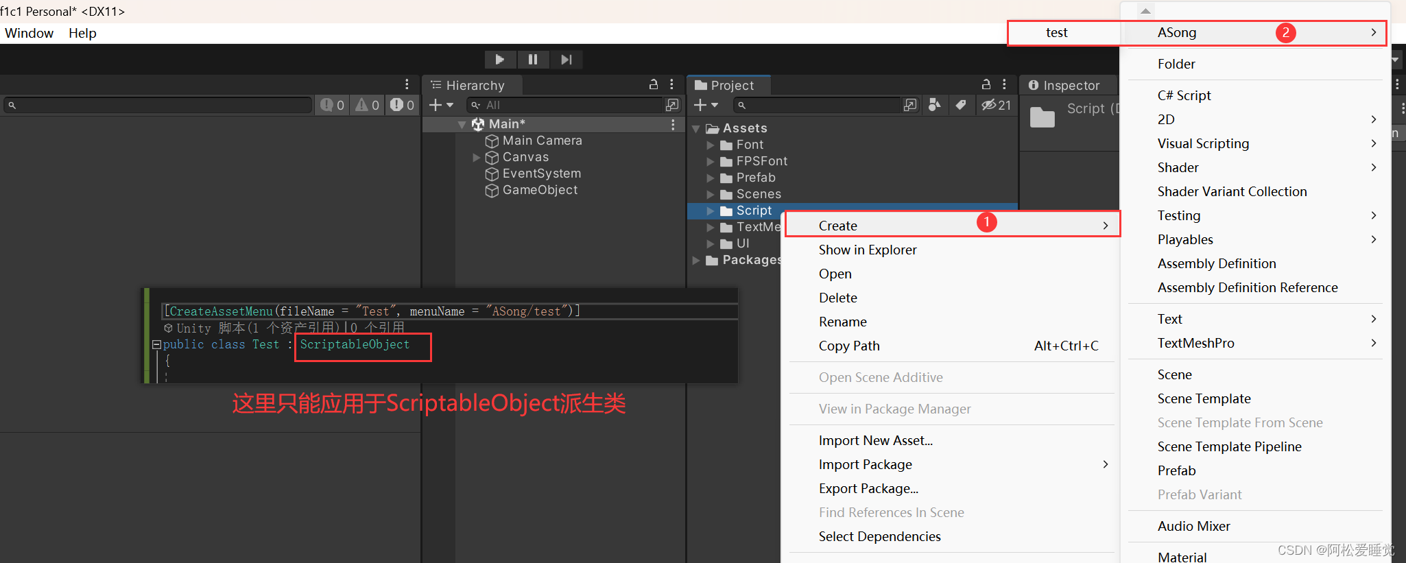 [CreateAssetMenu(fileName = "xxxx", menuName = "xxx/xxx", order = 0)] 参数说明: fileName:生成asset文件的文件名; menuName:在Assets/Create上子菜单的名字; order: 表示在 Assets/Create 下的位置顺序。