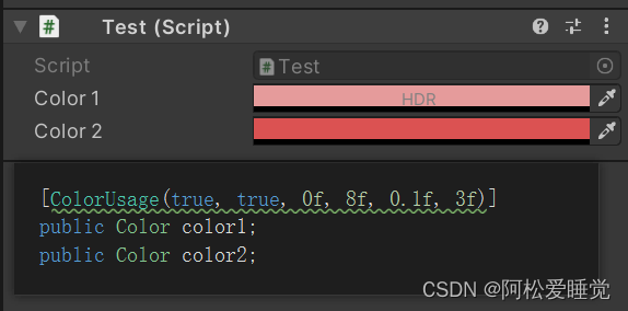 [ColorUsage(bool, bool, float, float, float, float)] 在Unity中,[ColorUsage]属性用于指定一个Color类型的字段如何在编辑器中显示和编辑。这个属性允许你限制颜色的编辑范围,例如,可以指定最小的亮度、饱和度或者Alpha值。这对于那些需要特定颜色范围的应用场景非常有用,比如光照颜色、材质颜色等。