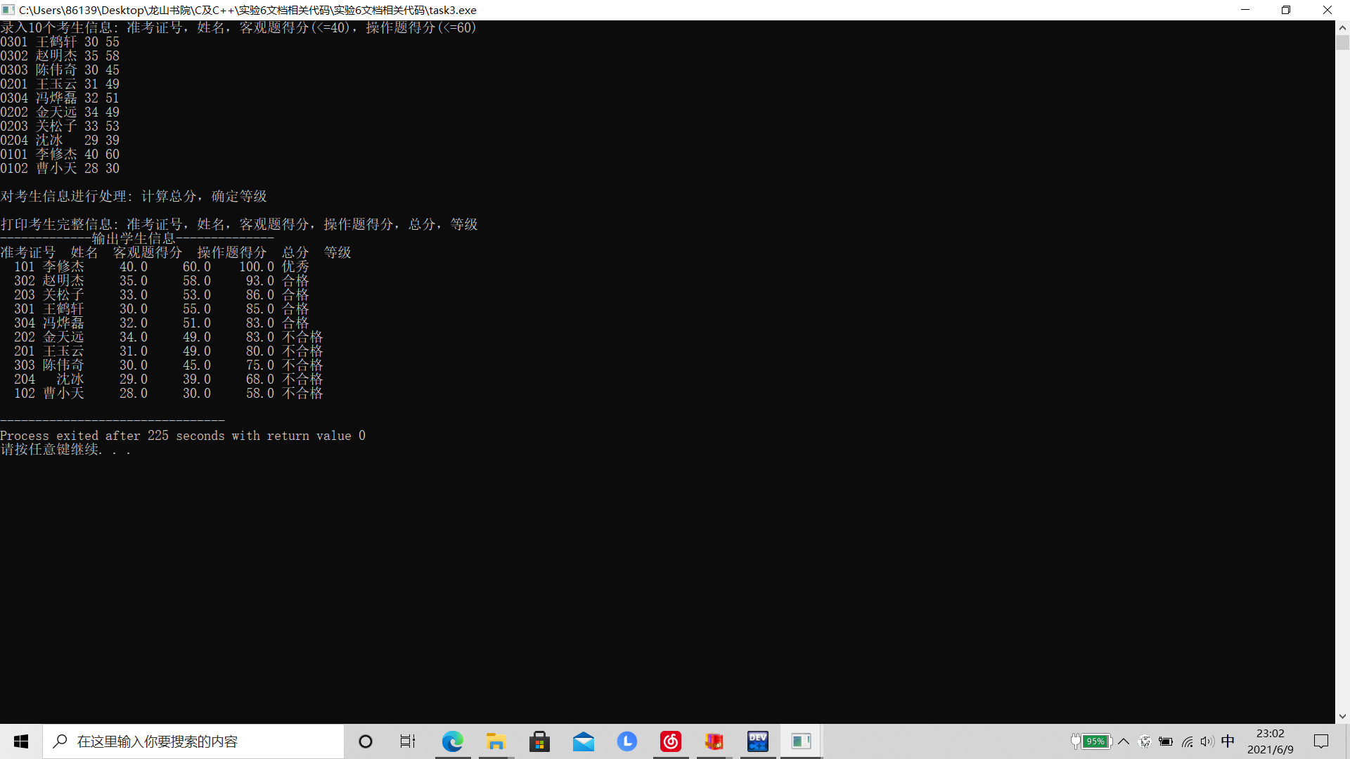 #include <stdio.h> #include <string.h> const int N = 10; // 定义结构体类型struct student,并定义其别名为STU typedef struct student { long int id; char name[20]; float objective; /*客观题得分*/ float subjective; /*操作题得分*/ float sum; char level[10]; }STU; // 函数声明 void input(STU s[], int n); void output(STU s[], int n); void process(STU s[], int n); int main() { STU stu[N]; printf("录入%d个考生信息: 准考证号,姓名,客观题得分(<=40),操作题得分(<=60)\n", N); input(stu, N); printf("\n对考生信息进行处理: 计算总分,确定等级\n"); process(stu, N); printf("\n打印考生完整信息: 准考证号,姓名,客观题得分,操作题得分,总分,等级\n"); output(stu, N); return 0; } // 录入考生信息:准考证号,姓名,客观题得分,操作题得分 void input(STU s[], int n) { for (int i = 0; i < n; ++i) scanf("%ld %s %f %f",&s[i].id,s[i].name,&s[i].objective,&s[i].subjective); } //输出考生完整信息: 准考证号,姓名,客观题得分,操作题得分,总分,等级 void output(STU s[], int n) { printf("-------------输出学生信息--------------\n"); printf("准考证号 姓名 客观题得分 操作题得分 总分 等级\n"); for (int i = 0; i < n; ++i) printf("%5ld %6s %8.1f %8.1f %8.1f %4s\n",s[i].id,s[i].name,s[i].objective,s[i].subjective,s[i].sum,s[i].level); } // 对考生信息进行处理:计算总分,排序,确定等级 void process(STU s[], int n) { //计算总分 for (int i = 0; i < n; ++i) s[i].sum=s[i].objective+s[i].subjective; //排序(冒泡排序,降序) STU temp; for (int i = 0; i < n-1; ++i) { for (int j = 0; j < n-1-i; ++j) { if (s[j].sum<s[j+1].sum){ temp=s[j]; s[j]=s[j+1]; s[j+1]=temp; } } } //根据比例划分等级 for (int i = 0; i < n; ++i) { if (i<=(n/10)-1) //数组序列从0开始 strcpy(s[i].level,"优秀"); else if (i<=(n/2)-1) strcpy(s[i].level,"合格"); else strcpy(s[i].level,"不合格"); } }