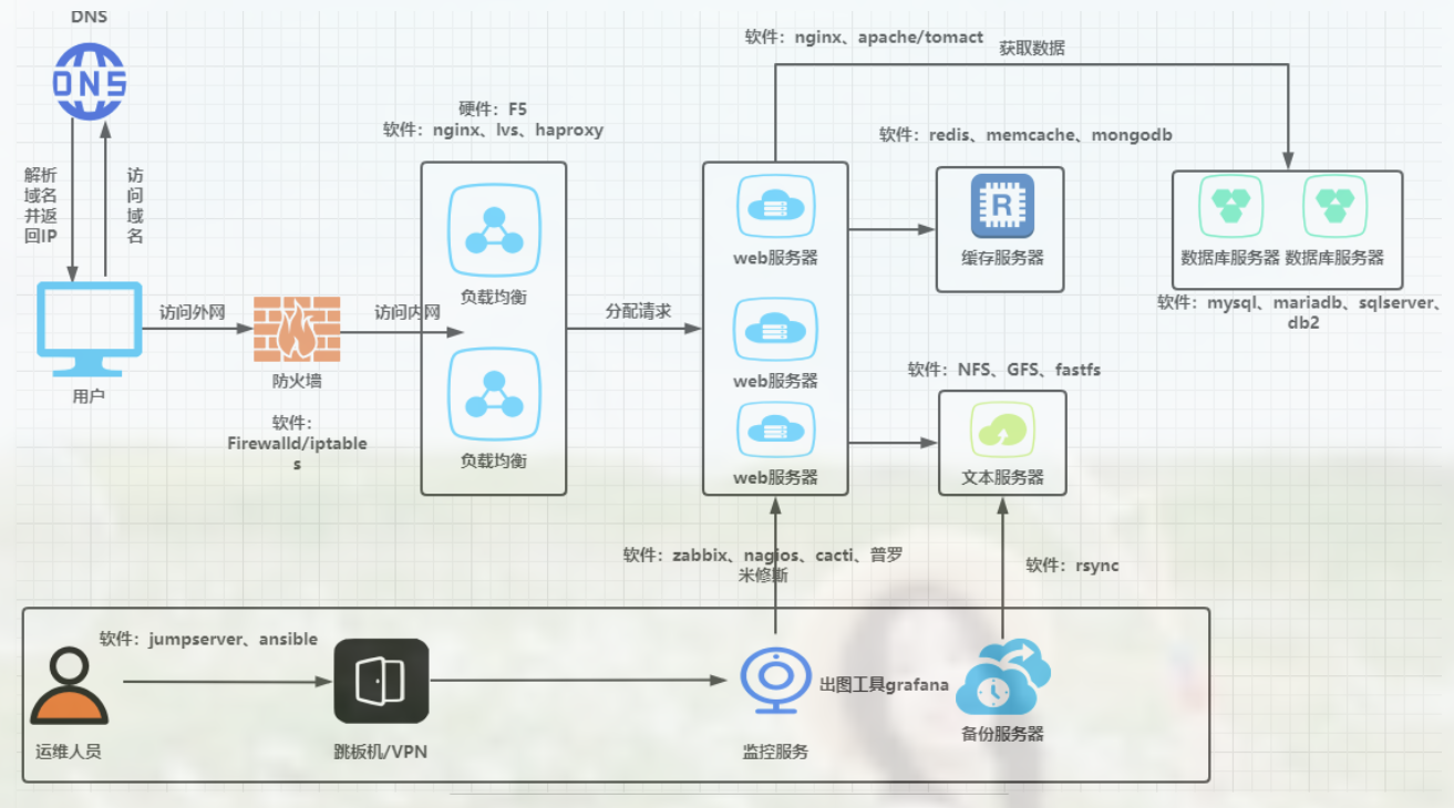 中级架构,分布式应用,中间层分布式+数据库分布式,是单体架构的并发扩展,将一个大的系统划分为多个业务模块,业务模块分别部署在不同的服务器上,各个业务模块之间通过接口进行数据交互。数据库也大量采用分布式数据库,如redis、ES、solor等。通过LVS/Nginx代理应用,将用户请求均衡的负载到不同的服务器上。其架构图如下所示: