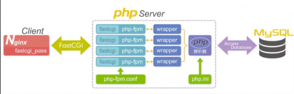 当用户发起http请求,请求会被Nginx处理,如果是静态资源请求Nginx则直接返回,如果是动态请求Nginx则通过fastcgi协议转交给后端的PHP程序处理