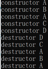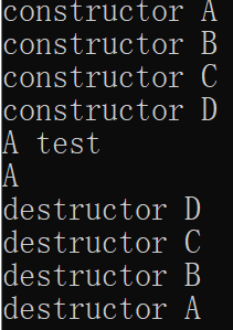 1 class A 2 { 3 public: 4 A() { cout << "constructor A" << endl; } 5 ~A() { cout << "destructor A" << endl; } 6 void show() { cout << "A" << endl; } 7 virtual void test() { cout << "A test" << endl; } 8 }; 9 10 class B: public A 11 { 12 public: 13 B() { cout << "constructor B" << endl; } 14 ~B() { cout << "destructor B" << endl; } 15 }; 16 17 class C: public A 18 { 19 public: 20 C() { cout << "constructor C" << endl; } 21 ~C() { cout << "destructor C" << endl; } 22 }; 23 24 class D: public B, public C 25 { 26 public: 27 D() { cout << "constructor D" << endl; } 28 ~D() { cout << "destructor D" << endl; } 29 }; 30 31 int main() 32 { 33 D d; 34 d.test(); // 报错,d.test() 不明确 35 d.show(); // 报错,d.show() 不明确 36 37 return 0; 38 }