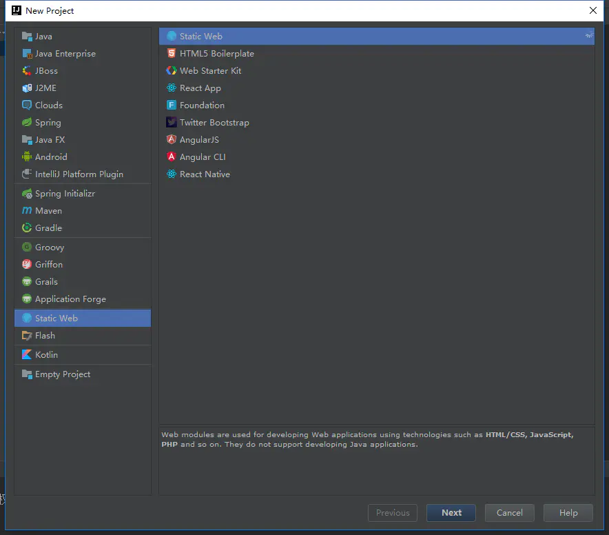 Create New Project > Static Web>填写project name和选择保存的工作空间>Finish