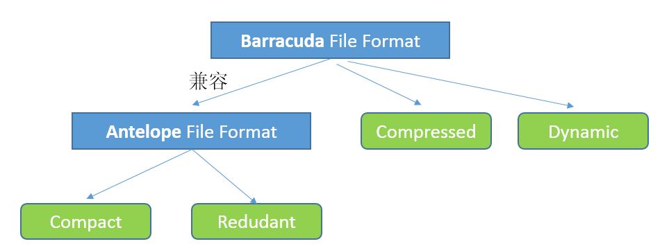Antelope是老的文件格式,其包含2种行格式:Compact和Redudant。5.6之后版本的默认文件格式是Barracuda:引入2种新的行格式:Compressed和 Dynamic。