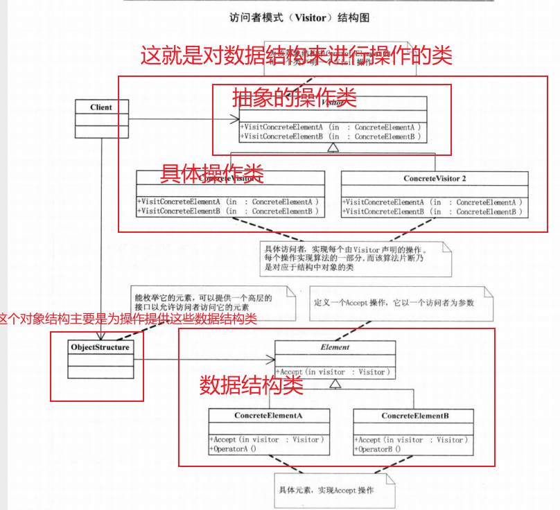 在这里访问者说:“表示一个作用于某对象结构中的各元素的操作”,这句话要对应图中,就是这个具体操作类,而后面说的“可以不改变各元素的类的前提下定义作用于这些元素的新操作”,这句就是体现在操作是可扩展,你可以在添加一个新的操作类,但是这些添加都是基于你的数据结构类时不会发生变化的,在添加操作这里它是符合开闭原则的,但是在数据结构这里就不行了,因为当你添加了新的数据结构,你的操作类这里要不要进行重新添加新的操作呢,之前的操作在这新添加的数据结构上适不适用呢?这些都是问题,所以这使用访问者的时候就要考虑清楚这些问题,它适用于一些数据结构不会发生改变的,但是操作有多种的情况下,这里的数据结构可以使人,这里的操作就是人的行为,这是比较抽象,这个数据结构还可以更加具体一些,但是要基于你不会发生变化。