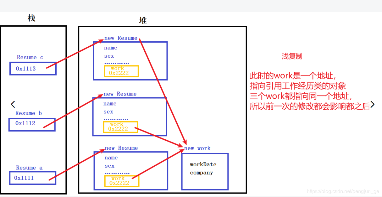 被复制对象的所用变量都含有与原来的对象相同的值,而所有的对其他对象的引用仍然都指向原来的对象。