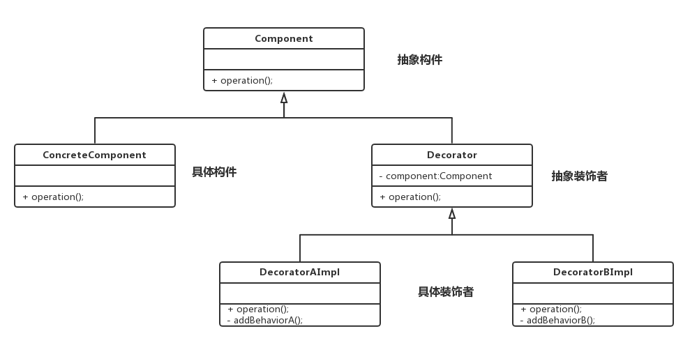 - 抽象构件角色(Component):定义一个对象接口或抽象类,可以给这些对象动态地添加职责。