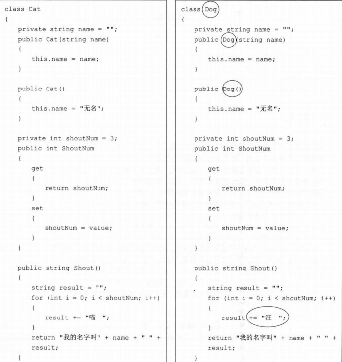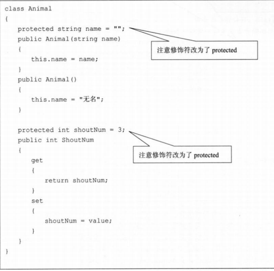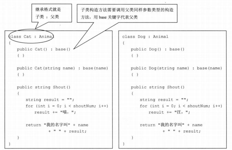 在这个图中相比较第一张图,代码量少了很多,就是因为通过继承把之前的Animal这个类的继承,所以说封装以后的事情就是继承,不然封装的意义就体现不出来了,在这里面要注意这个构造方法它不能被继承所以再子类这里就用了base这个关键字来调用父类的构造方法,通过封装与继承可以看出代码在以后的服用与修改都是会变得简单,之前的代码要修改狗和猫叫的次数要每个都修改,但是通过封装与继承只需要修改一处就行了。