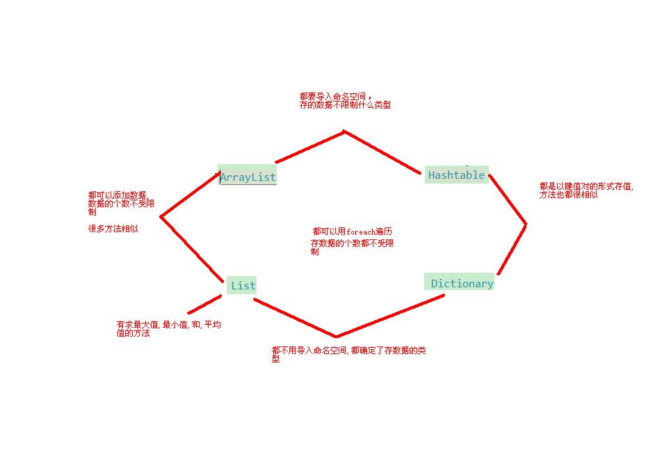 在C#中我们会用到这几个东西,List与ArrayList,Hashtable与Dictionary,这些分别都是什么呢,前面两个是集合,而后面两个分别是哈希表与字典,它们四个之间也是有很多的联系的,在我们代码中,list与arraylist之间有很多的区别,在使用的时候list可以直接使用,而arraylist却要导入命名空间,这是它们在使用的时候,而他们的方法就有很多的相似,可以说是重复的,只要理解其中一个,那么在用另外一个的方法你也能理解它的意思,count、Add、Remove...这些方法,都是一样的作用,只不过它们两个有点区别,list是一个泛型集合需要对应数据类型,而arraylist是一个存数据不受限制的非泛型集合,Hashtable与Dictionary就有一个共同的特点了,就是它们都是键值对,方法也是很相似,下图就是它们整体的一个关系。对于后续的整理再上传,这些是目前自己的理解,并且也是通过看视频以后知道了。感谢那些给补充的亲们。
