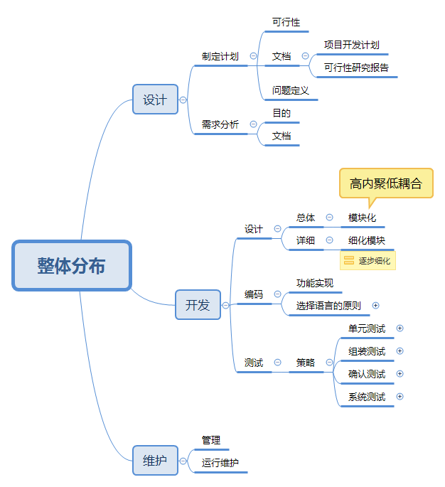 在开发阶段我们要现进行一个大方向的设计,对于主要功能就是把系统划分成模块。这就是概要设计,有了大方向后我们就把这些细化,把功能中的大模块逐个细化,这些模块间我们是遵循高内聚低耦合,这是评价一个软件好坏的标准之一。这个步骤完成后我们就要开始编码了,对于编码的要求就是语言上的了。软件完成后就要测试了,测试阶段就是在项目编写完成之后,对其进行测试,确定是否完成用户需求,是否正确,是否可以交付用户使用。测试根据设计阶段产生的测试计划,设计测试用例,对项目进行测试,测试完成之后编写测试分析报告,分析测试的结果,确定是否可以交付用户使用。不行,则项目调试,调试完测试,直至测试合格,发布使用。