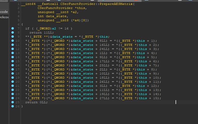这里出现了PrepareAESMatrix这个函数,参数是我们输入的字符串,其他几个参数我们暂时不知道,跟进这个函数看看