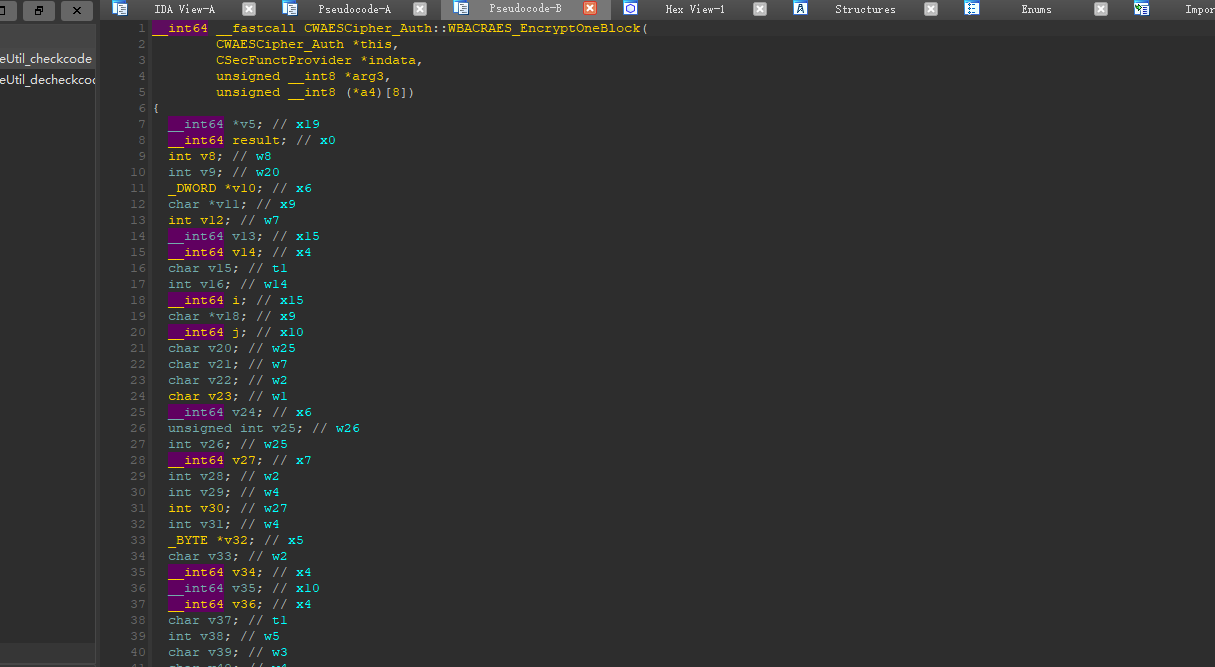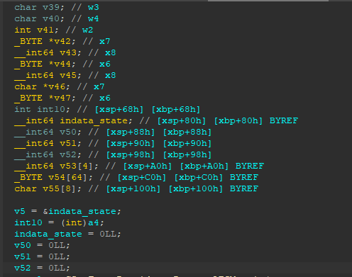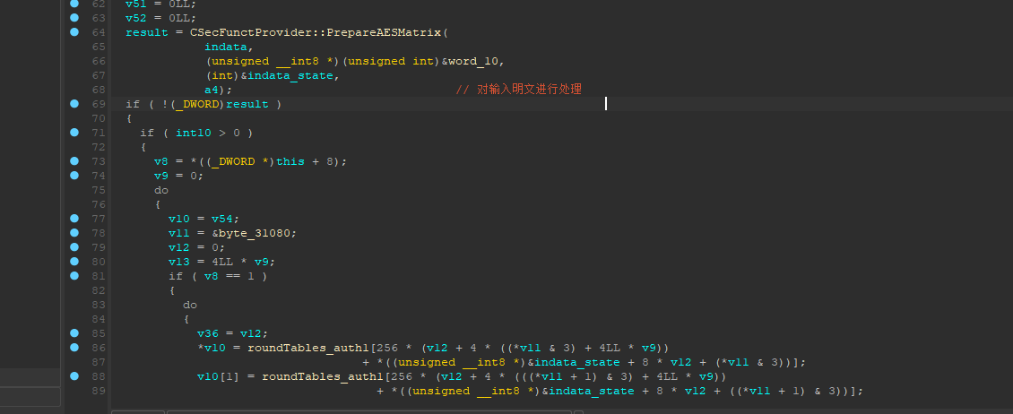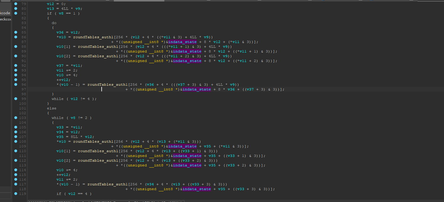 确实是对明文进行处理,这里先命名为indata_state,aes加密就是使用对明文进行处理,然后与密钥处理后的结果进行十轮加密,十轮加密都会对indata_state进行修改,因为没找到分析密钥,分析应该是白盒aes加密