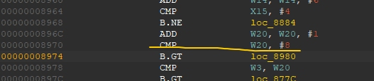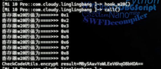 这里w20存的就是v9的值,我们可以在hook偏移8970,查看寄存器的值,判断到底cmp了多少次