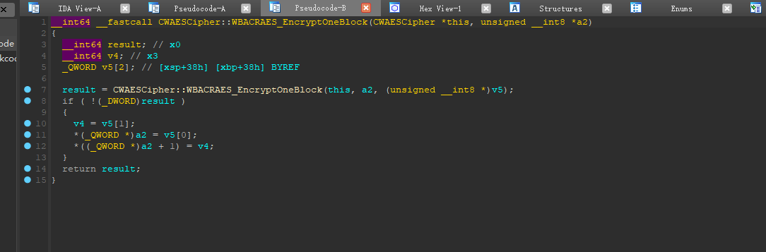 可以发现这里应该进行了9轮加密,符合aes加密轮数,那我们在进入第9轮时,更改indata_state的内容,注入故障文就行,(对于10轮函数的AES-128,DFA攻击通常将最后两轮设为目标。当故障注入到最后2轮中时,密文的某一些字节会受到故障的影响。)这里为了方便查看,call()主动调用采用16字节"0123456789abcdef"