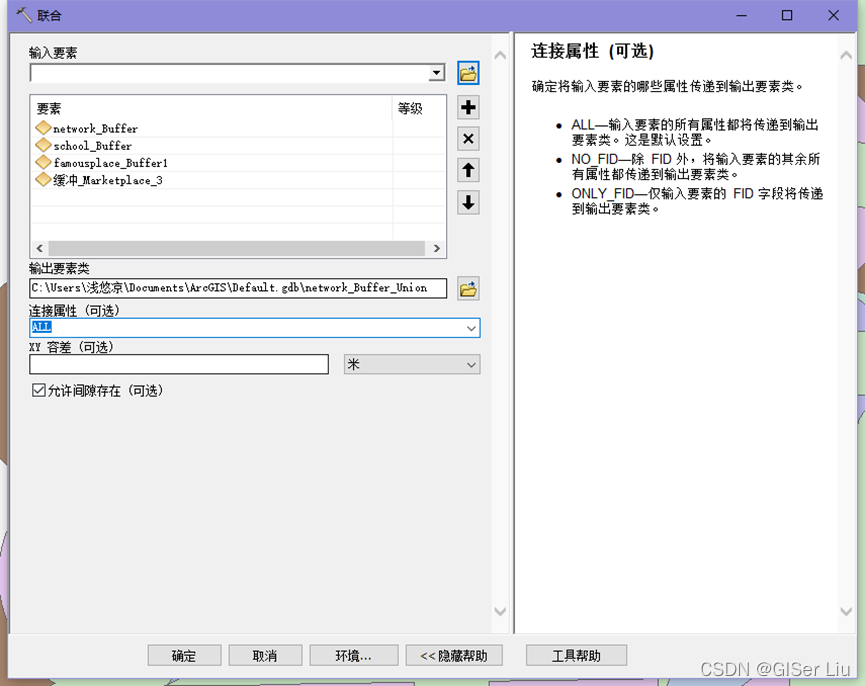 4.完成四个要素赋值后,我们需要使用联合工具来得到该区域每个位置的四项评分,搜索栏输入联合,打开联合工具,输入要素选上述四个结果,点击确定,打开结果属性表,可以发现这些结果的字段被继承了下来,我们添加一个短整型总分字段,记录总评分,打开字段计算器,输入公式为四项评分字段之和,点击确定,这样我们就得到每一个地块的评分值;