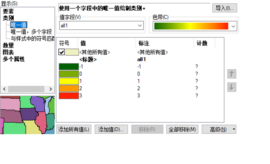 5.现在,我们需要对结果根据分值的不同,对其进行分层设色显示,右击该结果,选择属性,点击符号系统选项卡,类型选择唯一,字段选择总得分all,点击下方的添加所有值,选择合适的色带,点击确定即可得到合适的分层设色图;