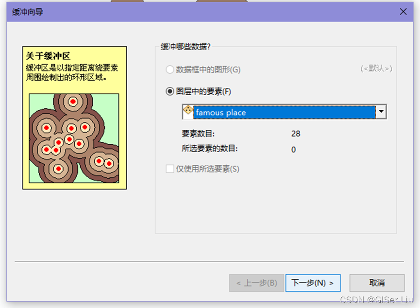 4.下面创建景点的缓冲区,同上操作,图层选择famous place,因为题目已给出指定的距离,因此我们选择以指定的距离500m,其他默认,完成输出;