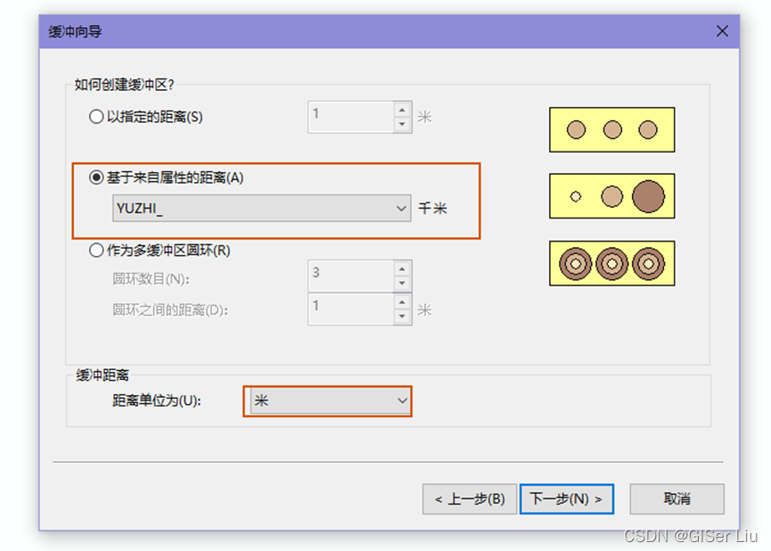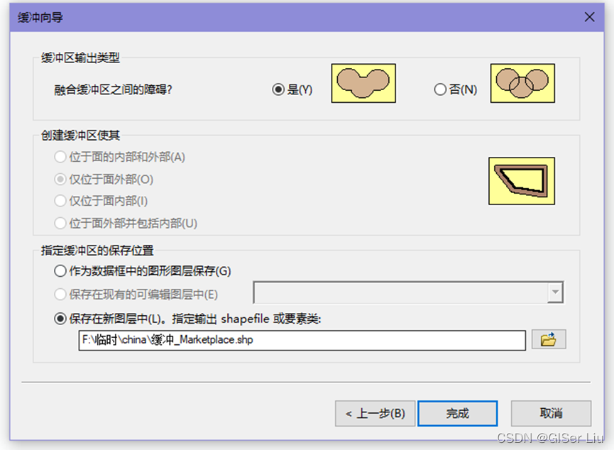 3.点击打开缓冲向导,根据向导逐步实现缓冲区的构建:首先图层选择Marketplace,点击下一步,缓冲区距离在属性字段阈值里,我们选择基于来自属性的距离,字段选择YUZHI_,点击下一步,缓冲区的数据类型决定了各个点缓冲区的结果是否为独立要素,在这里我们无需将每个点的缓冲区结果独立出来,因此我们选择融合结果,f其他参数默认即可,点击生成,这样就完成了超市缓冲区的创建;