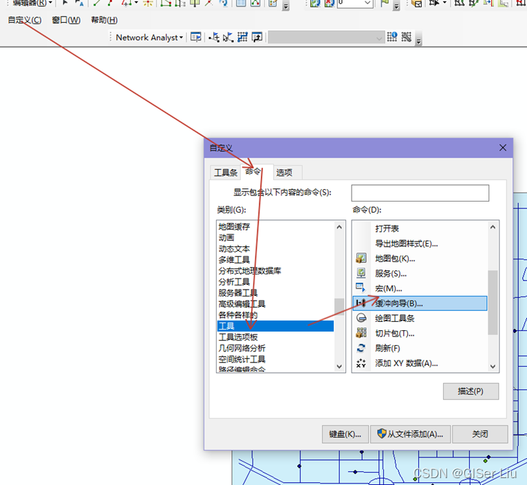 2.添加缓冲区向导按钮,点击自定义菜单,选择自定义模式,在对话框中选择命令选项卡,类别>工具>缓冲向导,将其拖至地图浏览工具栏中;