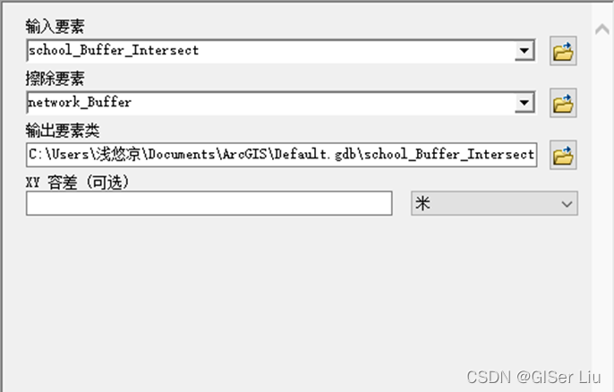 7.因为需求要求所选地址在主干道200以外,我们可以选择叠加分析下的擦除工具,点击擦除工具,输入要素选择刚才的相交结果,擦除要素为刚才的道路缓冲区,选择输出位置,点击确定,我们即可得到最终的输出结果;