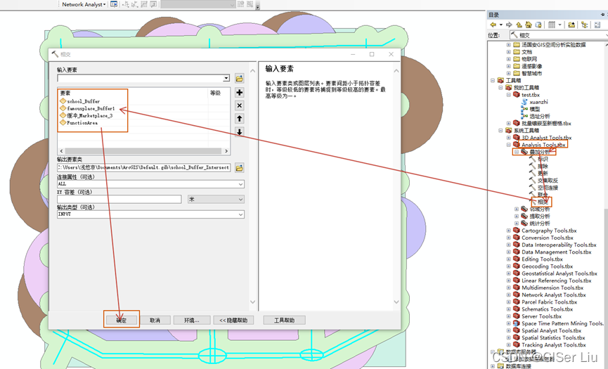 6.完成四个要素的缓冲区创建后,我们需要求取它们的公共部分,可使用相交工具实现,打开ArcToolBox,依次选择分析工具>叠加分析>相交,将学校、景点、超市、图幅范围添加为输入要素,设置输出路径,输出即可;