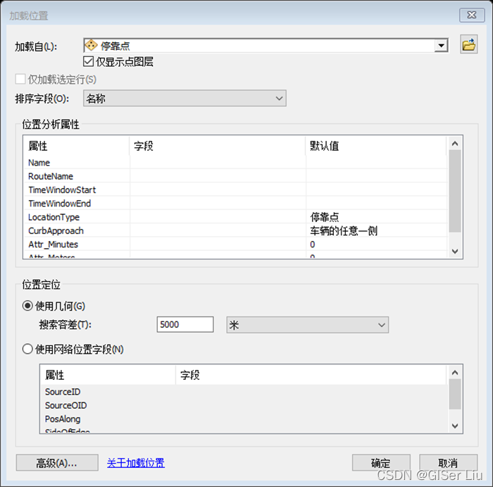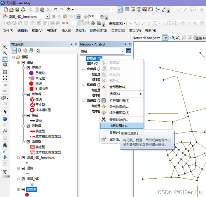 4、打开网络分析窗口,在停靠点上右击选择加载位置加载停靠点数据,并用名称排序,将目的地调整至最底部;