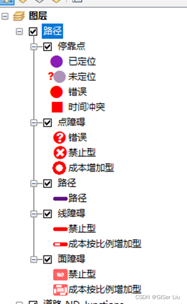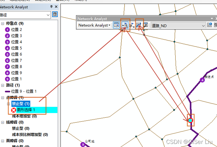 选择点障碍,用创建网络位置工具在阻碍处添加一个障碍点,然后重新求解,即可获得新的路径。