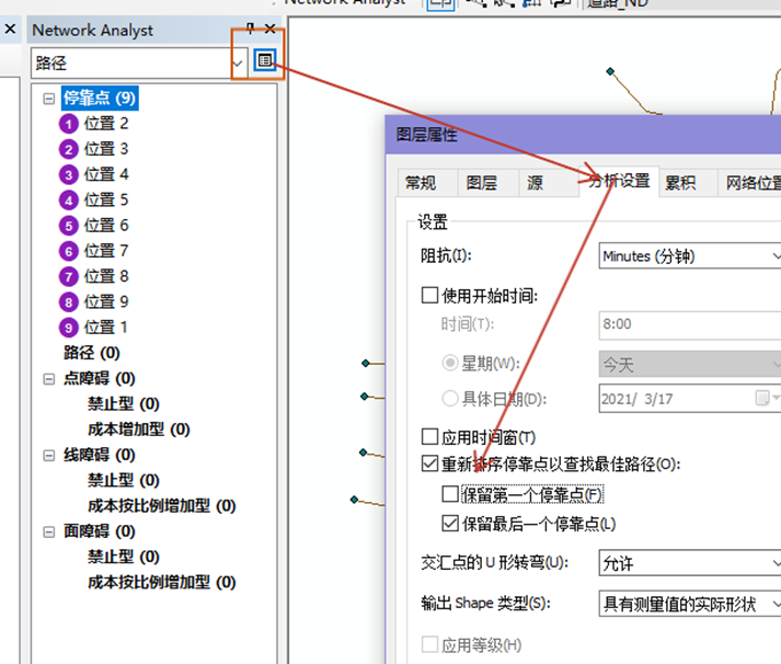 5、点击network右边的路径属性窗口,选择分析设置,在“重新排序停靠点以查找最佳路径”打勾,只保留最后一个停靠点,其他设置默认,点击确定;点击求解按钮,即可求得最优路径;