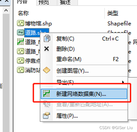 5.数据处理好后我们就可以开始网络数据集的创建了(提前在自定义模块勾选网络分析),打开ArcCatalog或目录(这里以ArcCatalog为例),选择“道路.shp”右击新建网络数据集