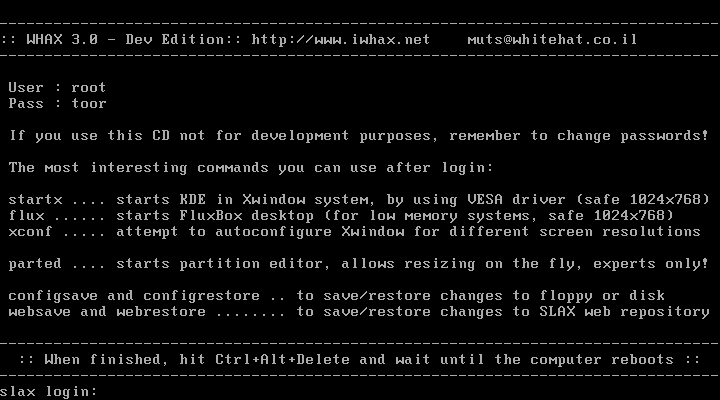 起初只是一个用于单一评估的 "快速小东西",现在已经开始有了吸引力。随着Whoppix的普及,它变得越来越难开发。当时,Slax在生成Live-CD和使用OverlayFS方面有一个更成熟的工具链。因此,它是一个更适合的选择。编者注:我们不能确定,但镜像文件的大小可能已经成为一个问题。随着更多的工具想要被加入,空间也就越来越小。当时CD-R正处于高峰期,可以提供650-700MB,而USB媒体还没有出现。通过换到Slax,基本的操作系统大小下降,并允许更多的自定义软件包被包括在内,以及更严格的压缩(LZMA)。总的来说,这给了我们更多的发展空间。