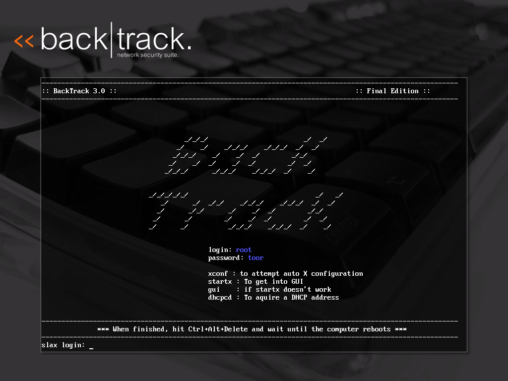 BackTrack现在有了一个稳定、成熟的Live-CD项目,这正是当时空隙网络的问题所需要的。虽然这些Live-CD是某些情况下的答案,但该团队希望扩展到更多领域。U盘的成本大幅下降,因此可以更自由地使用。于是就有了向 "Live-Boot"(CD或USB)的转变。下一个要解决的问题是让他们的数据 "持久化",而不是在关闭电源时丢失。2008年6月,进入BackTrack 3。