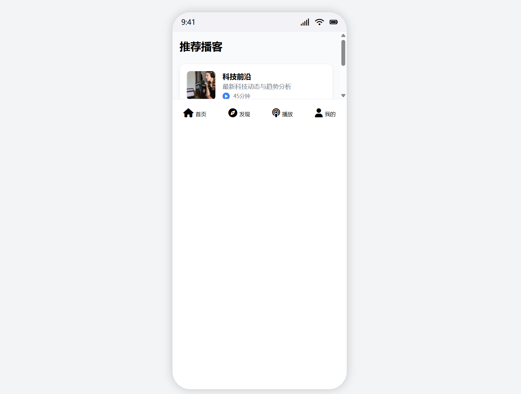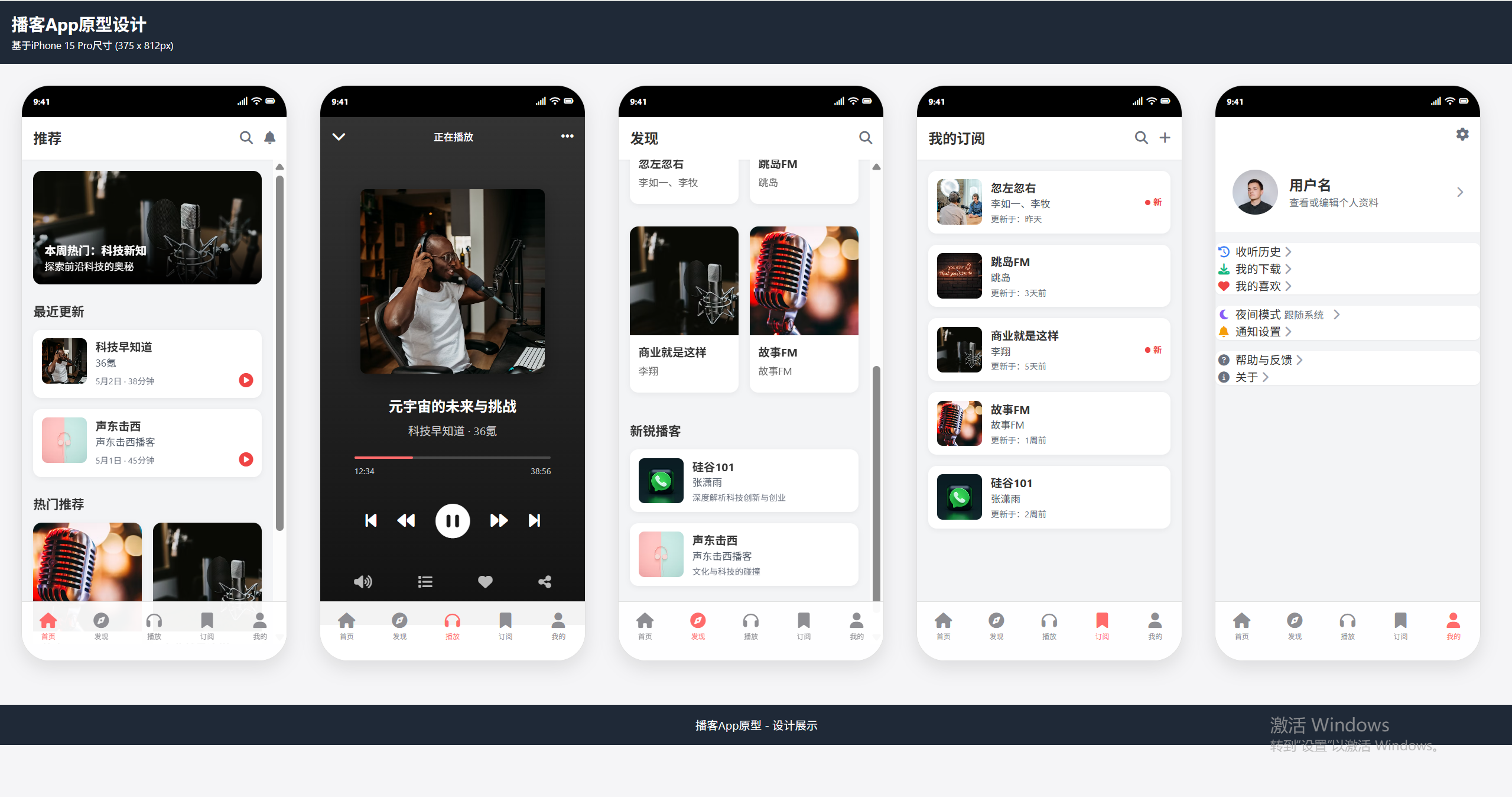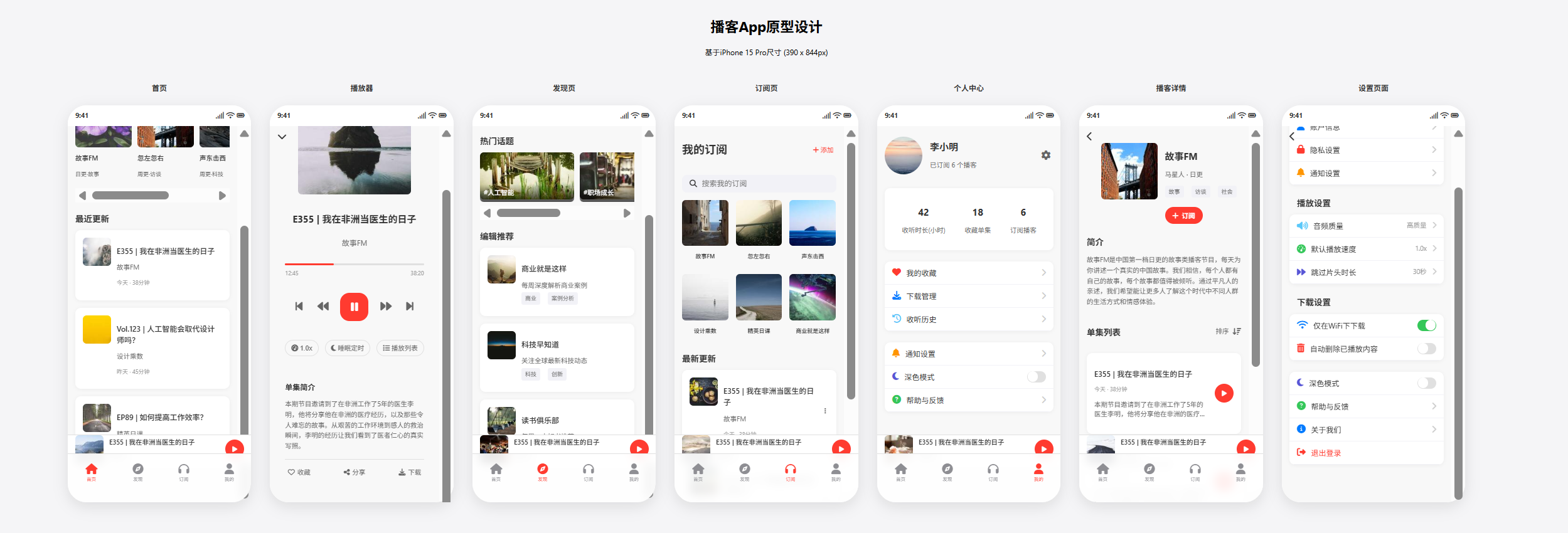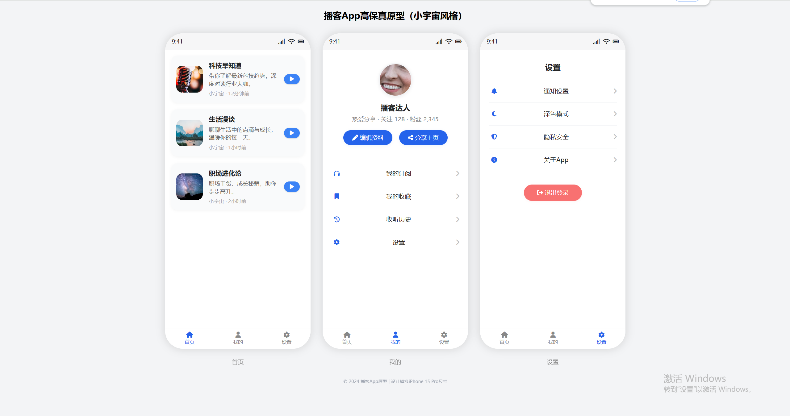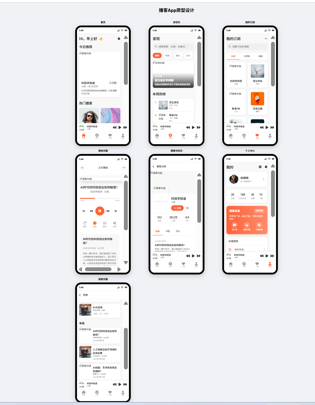 我想开发一个{类似小宇宙的播客app},现在需要输出高保真的原型图,请通过以下方式帮我完成所有界面的原型设计,并确保这些原型界面可以直接用于开发: