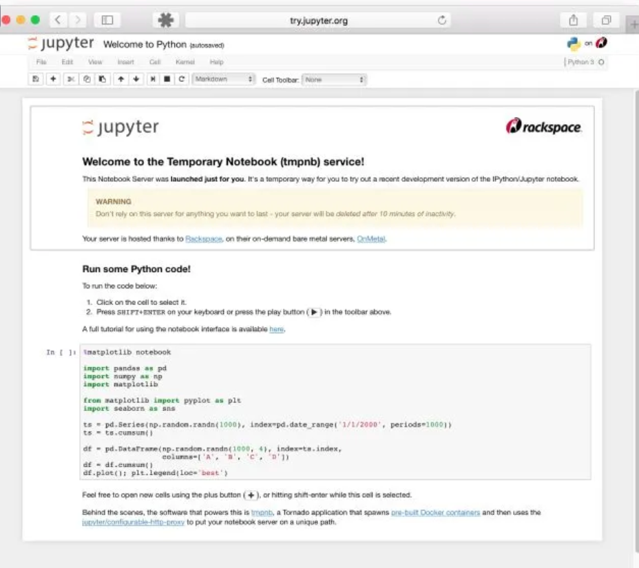 最蛋疼的地方在于,有些数据分析的中间结果,还得重新跑代码,然后把结果弄到文档里给客户看。有了notebook之后,世界突然美好了许多,因为notebook可以直接在代码旁写出叙述性文档,而不是另外编写单独的文档。也就是它可以能将代码、文档等这一切集中到一处,让用户一目了然。如下图所示。