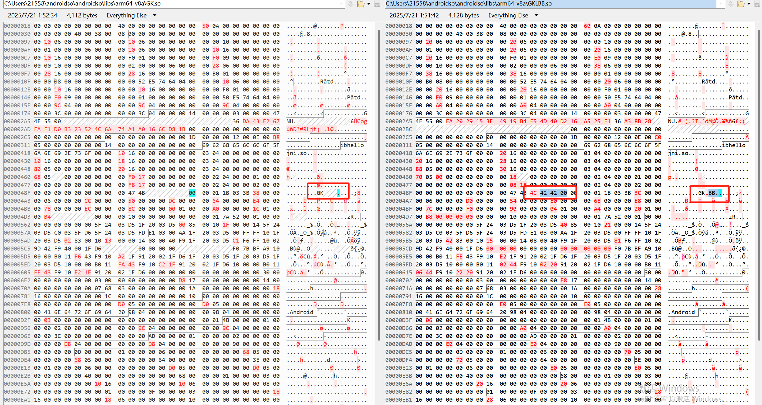 当你仅仅修改了一个字符串,从 "GK" 变为 "GKLBB",你不仅仅是替换了几个字节,而是改变了数据段的大小。这个大小的改变(从3字节 G K \0 变为6字节 G K L B B \0)会引发一系列连锁反应,导致文件中许多看似无关的部分都发生变化。