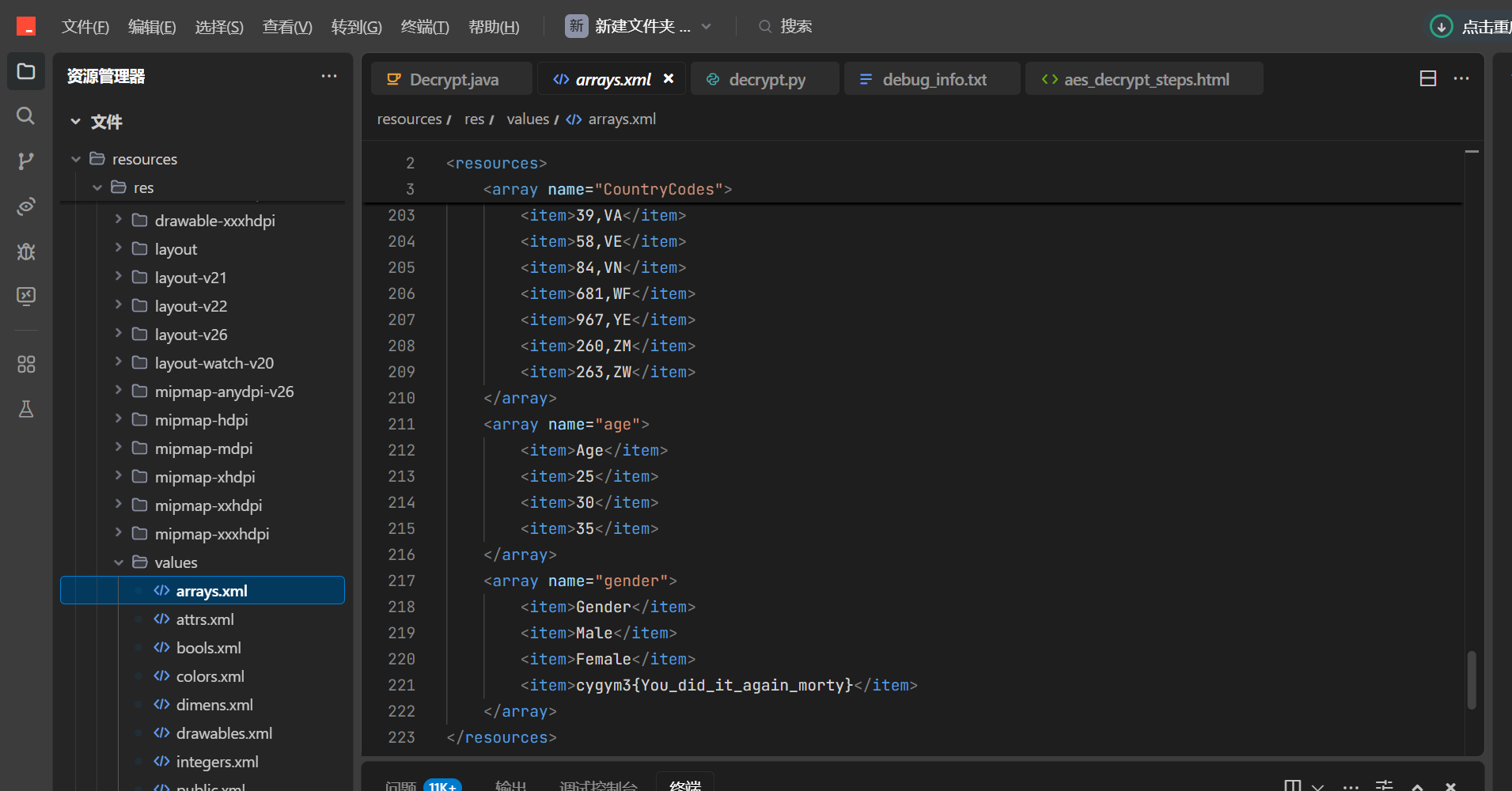 我们用jadx分析导出源码后导入trae发现解密了一个提示错误的flag,死活trae找不到flag,其实这是一个兔子洞问题